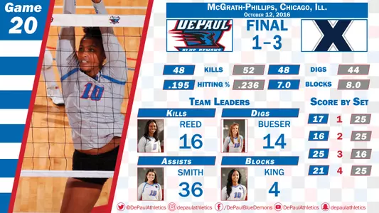 CHICAGO - DePaul opened a four-game home stand by dropping a four-set match against Xavier, 3-1 (25-17 25-16, 16-25, 25-21). The Blue Demons fall to 5-3 in BIG EAST play, while Xavier improves to 4-3.