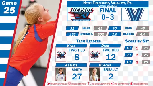 VILLANOVA, Pa. - In a battle between the fourth and fifth place teams in the BIG EAST standings, DePaul dropped the match Saturday at Villanova, 3-0 (25-18, 25-20, 25-19). The Blue Demons fall to 7-6 in the BIG EAST standings (13-12 overall), while the Wildcats move to 7-5 (16-8 overall).