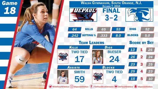 With the match on the line, DePaul grabbed an early five-point advantage at 15-10, capped by a 3-0 rally. The Blue Demons held a comfortable lead until late in the set when Seton Hall used a 4-0 run to tie the set at 22-all. A pair of Seton Hall service errors and a Anderson kill helped the Blue Demons force a fifth set for the second match in a row.