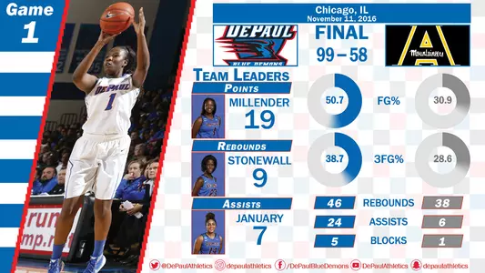 Behind Ashton Millender's 19 points and 16 from Amarah Coleman, the Blue Demons ran past Appalachian State 99-58 in the Maggie Dixon Classic. After forcing 32 turnovers, they advance to Saturday's title game and face UAB (1-0) at 8 p.m.
