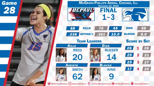 Colleen Smith guided DePaul's offensive attack and totaled 62 assists in the loss. The senior also had a team-best two service aces and added nine digs.