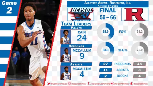 The Blue Demons saw their record drop to 1-1 while Rutgers improved to 3-0. Eli Cain led DePaul with 24 points on 8-of-13 shooting including 5-of-7 from three-point range.