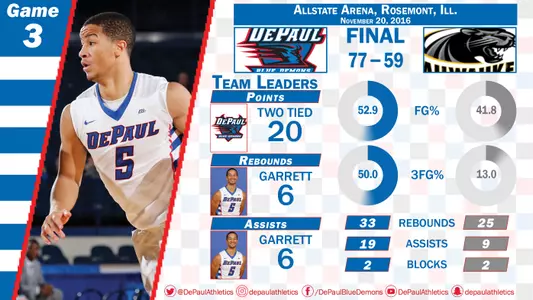 Garrett added six rebound and six assists to his 20 points while Cain grabbed five rebounds with a pair of assists. Darrick Wood scored 12 points off the bench with four assists for the Blue Demons.
