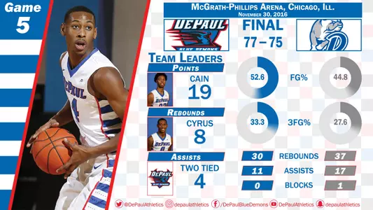 CHICAGO - Eli Cain's three-point play with 39.9 seconds left and a Brandon Cyrus free throw made all the difference in DePaul's thrilling 77-75 comeback win over Drake Wednesday night at McGrath-Phillips Arena.