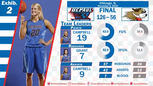 The Blue Demons combined to shoot 63 percent and freshman Kelly Campbell led seven players in double figures with 19 points. Jessica January and Amarah Coleman both scored 17 points while Brooke Schulte (16), Chante Stonewall (15), Jacqui Grant (13) and Deja Cage (11) all reached double digits for the Blue Demons.