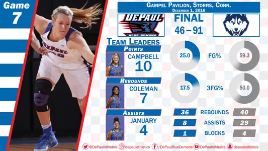 STORRS, Conn. -- No. 15/14 DePaul got off to a slow start and could not recover as it fell at No. 2/2 Connecticut 91-46 on Thursday at Gampel Pavilion. UConn improves to 6-0, while the Blue Demons fall to 5-2 with both of its losses coming to teams ranked in the top five.