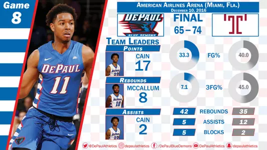 DePaul (5-3) found themselves 25 points behind Temple following an Owl basket by Ernest Aflakpui with 9:09 left in the game. A three-pointer by Eli Cain on DePaul's next possession kick-started an impressive run that would end with the Blue Demons down five in the final minute of play.