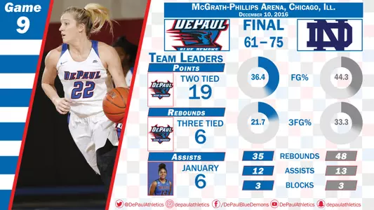 DePaul (6-3) was led by Jessica January with 19 points, six rebounds and six assists along with Brooke Schulte with 19 points and six rebounds. Arike Ogunbolwale led Notre Dame (9-1) with 17 points.