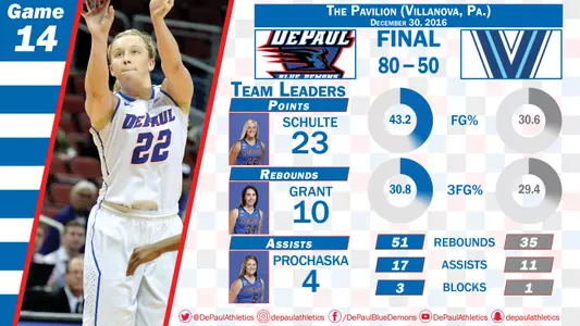 Brooke Schulte led the Blue Demons with 23 points and added seven rebounds as coach Doug Bruno's team improved to 10-4 and 2-0 in conference. Villanova dropped to 4-8, 0-2.