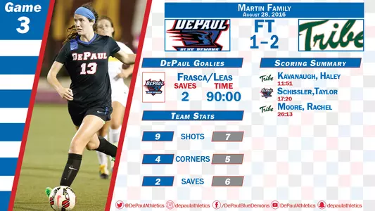 DePaul dropped a 2-1 decision to William and Mary which advanced to the second round of the 2015 NCAA tournament. The Blue Demons are 0-2-1 on the season.