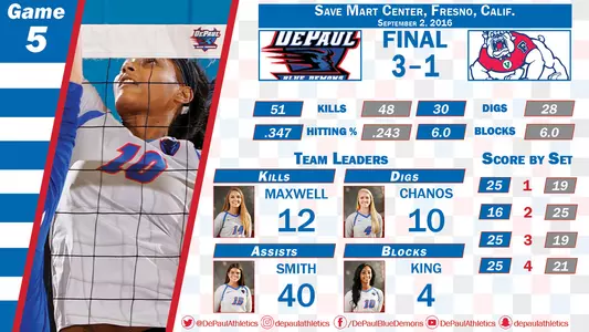 FRESNO, Calif. - The DePaul volleyball team closed its Friday in the Bulldog Showdown with a win over host Fresno State Friday night, 3-1 (25-19, 16-25, 25-19, 25-21). DePaul, moving to 3-2 on the year, handed Fresno State (5-1) its first loss of the year.