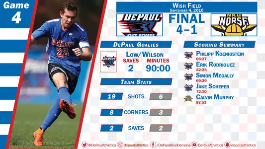 Goals by Philipp Koenigstein, Erik Rodriguez, Simon Megally and Jake Scheper led the Blue Demons to a 4-1 victory over Northern Kentucky in the Chicago Classic.