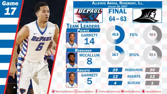 DePaul trailed by 11 points before closing the game with the impressive run. With DePaul trailing, 55-44, Garrett started the run with a three-pointer. Four different players scored during the run and DePaul combined to go 9-for-9 from the free throw line down the stretch.