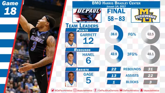MILWAUKEE - Marquette used a run in the final nine minutes of the first half that visiting DePaul couldn't overcome as the Blue Demons lost, 83-58, on Saturday. Billy Garrett Jr. scored 12 points to lead the Blue Demons while Darrick Wood chipped in 11 off the bench.