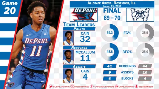 ROSEMONT, Ill. - DePaul couldn't hold off No. 13/14 Butler and fell in overtime, 70-69, on Saturday afternoon at Allstate Arena. Eli Cain scored a career-high 32 points and Tre'Darius McCallum recorded a 15-point, 11-rebound double-double.