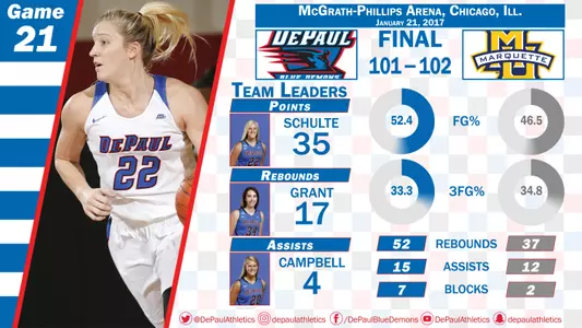 Brooke Schulte's career-high 35 points and Jacqui Grant's career-high 27 points and career-high 17 rebounds weren't quite enough on this night. Danielle King led Marquette (16-4, 7-2) with 27 points. Amarah Coleman added 17 points and made some huge shots in crunch time while Tanita Allen scored 12 points for DePaul (16-5, 8-1).