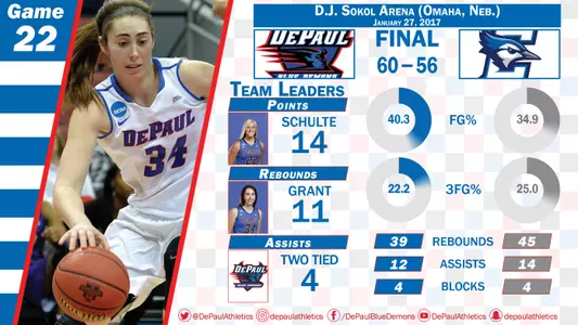 It was the Blue Demons with a hard-fought 60-56 victory as Brooke Schulte had 14 points and 10 rebounds, Amarah Coleman 13 points and Jacqui Grant 12 points and 11 boards.