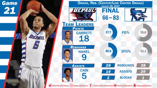 OMAHA, Neb. - DePaul dropped an 83-66 decision on the road Saturday afternoon against 16th-ranked Creighton. Billy Garrett Jr. scored 18 points to lead the Blue Demons and Brandon Cyrus added 12 with six rebounds.