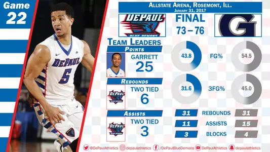 ROSEMONT, Ill. - Tre'Darius McCallum's game-tying three went in-and-out with time expiring, as DePaul fell to Georgetown 76-73 Tuesday night at Allstate Arena. Billy Garrett Jr. led the Blue Demons with 25 points and broke the program record for career free throws in the second half.