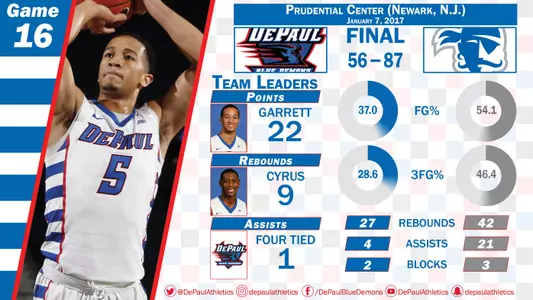 Garrett was the lone player in double-figures for the Blue Demons and he added three steals and two rebounds to his 22 points. Eli Cain added nine points and Tre'Darius McCallum finished with seven points and five rebounds.