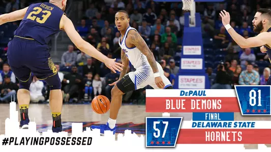 CHICAGO - Four in double-figures led DePaul over visiting Delaware State as the Blue Demons notched their first victory of the 2017-18 season. DePaul led from start-to-finish coasting to an 81-57 win at Wintrust Arena.