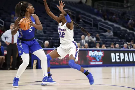 She scored 14 points in the second and third quarters and went 4-for-4 from long distance in helping keep the Blue Demons within 41-40 at halftime and 60-58 after three quarters.