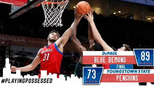CHICAGO - Five Blue Demons finished in double-figures as DePaul led start to finish en route to an 89-73 win over the visiting Youngstown State Penguins. Max Strus led DePaul with 20 points while Tre'Darius McCallum, Marin Maric, Eli Cain and Brandon Cyrus finished with 17, 17, 15 and 12 respectively.