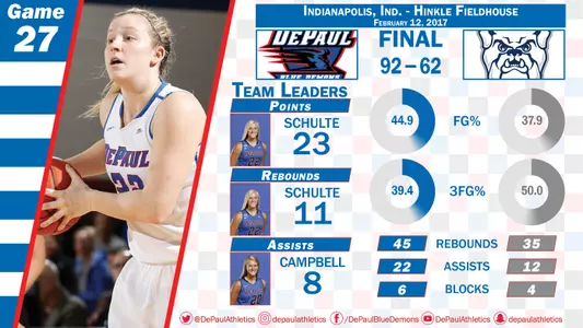 Leading the Blue Demons (22-5, 14-1) to their 16th win in the last 17 games was Brooke Schulte with 23 points, 11 rebounds and five assists. Amarah Coleman added 18 points and freshman Chante Stonewall finished with a season-high 15 points.