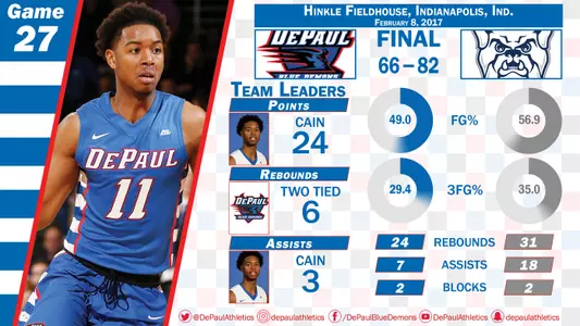 INDIANAPOLIS, Ind. - Eli Cain led DePaul with 24 points, but a scoring drought that covered the end of the first half and start of the second half saw the Blue Demons drop an 82-66 decision at No. 24/25 Butler on Sunday afternoon. Joe Hanel added 10 points for the Blue Demons.