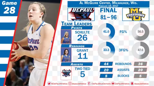 Down by 18 at halftime, DePaul closed to 59-45 early in the third quarter after a 9-3 burst led by Schulte's three-straight baskets. By the midpoint of the quarter, the Blue Demons had outscored Marquette 18-8 to draw within 64-54.