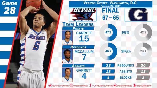 WASHINGTON, D.C. - Two free throws by Billy Garrett Jr. with two-tenths of a second left secured a 67-65 win for DePaul at Georgetown on Wednesday night. Garrett totaled 15 points while R.J. Curington scored 14 off the bench for the Blue Demons.
