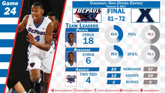 CINCINNATI - Brandon Cyrus scored a career-high 18 points and grabbed six rebounds as Xavier held off DePaul and defeated the Blue Demons on Wednesday night. DePaul pulled to within four points midway through the second half, but could get no closer in the 72-61 loss.