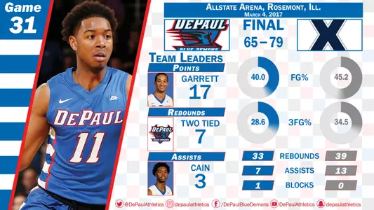 ROSEMONT, Ill. - In the final game at Allstate Arena for DePaul basketball the Blue Demons fell, 79-65, to Xavier. Billy Garrett Jr. led the Blue Demons with 17 points while Eli Cain and Chris Harrison-Docks added 15 and 11 each.