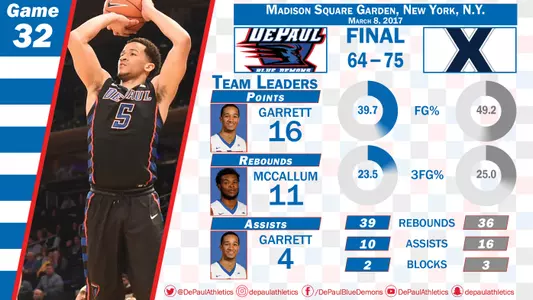 NEW YORK - A slow start coming out of halftime was too much to overcome as DePaul fell to Xavier, 75-64, in the first round of the BIG EAST Tournament. Eli Cain, Billy Garrett Jr. and Tre'Darius McCallum all scored in double-figures for the Blue Demons.