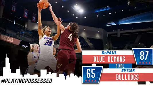 The first quarter was played at Butler's tempo with the score in single digits until DePaul (15-5, 6-1) closed with an 8-1 run to take a 15-7 lead into the second quarter. Three-pointers by Stonewall and Lauren Prochaska (five assists) led the charge as the Blue Demons forced eight turnovers.