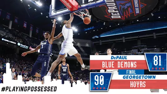 Midway through the second half, a three-pointer by McCallum off a beautiful baseline pass from Eli Cain pulled DePaul with within four points. Two minutes later, Maric's dunk made the score 61-60 before Georgetown reeled off 11 straight points to take control of the game for good. The Blue Demons would get no closer than five points in the final minute before the buzzer sounded with a 90-81 final.