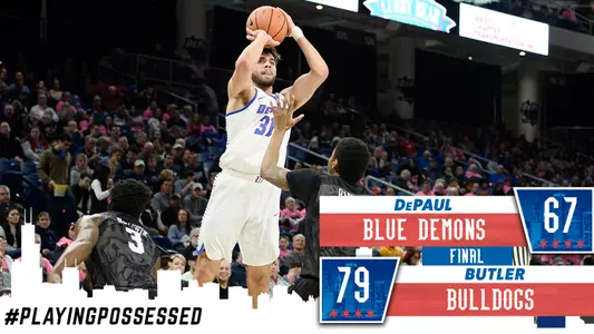 CHICAGO - Max Strus scored 27 points for the Blue Demons, but DePaul could not overcome a halftime deficit in a 79-67 defeat against visiting Butler on Saturday afternoon. Eli Cain added 14 points for the Blue Demons.