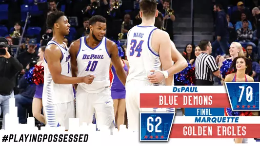 CHICAGO - Playing in front of a raucous Wintrust Arena crowd Saturday afternoon the Blue Demons came back from a nine-point first half deficit in a 70-62 win over visiting Marquette. Max Strus led DePaul with a 20-point, 11-rebound double-double while Marin Maric posted his own double-double with 13 points and 13 rebounds.